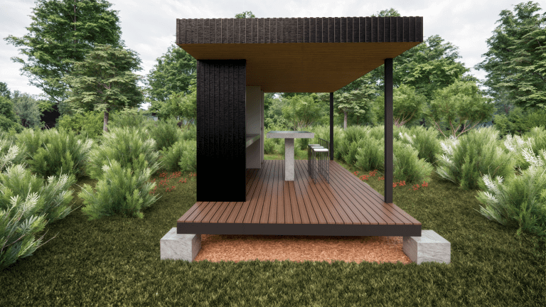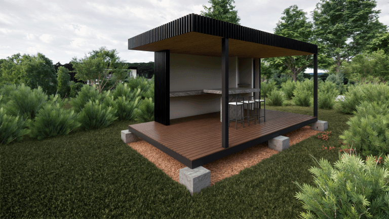 - Equipamiento: El quincho incluye un práctico mueble mesón con terminación similar al hormigón y repisas inferiores, despensa, parrilla de acero con altura ajustable, campana extractora y lavacopas, pensado para disfrutar al máximo cada reunión.