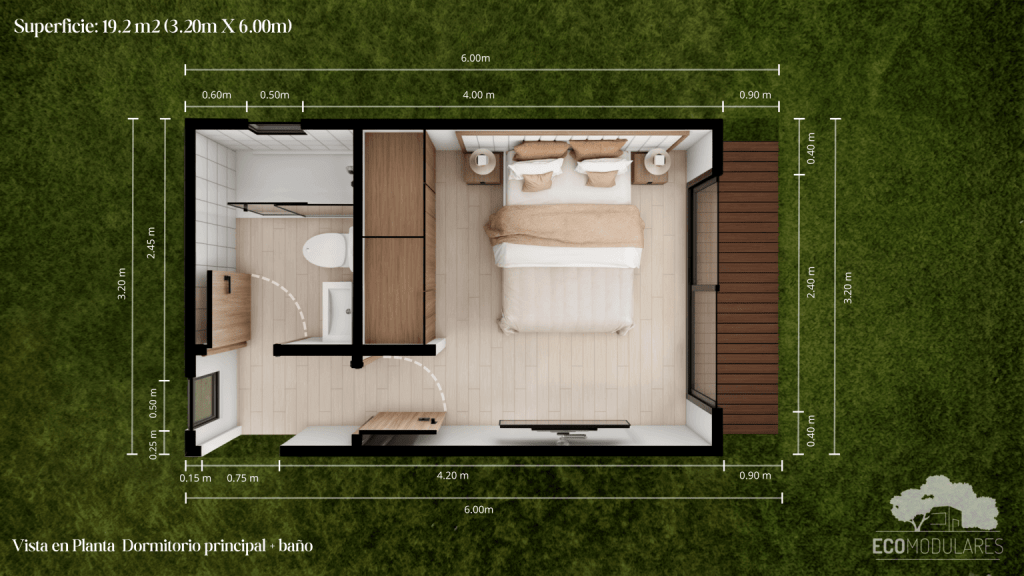 - Son 19,2 m2, Largo 6 metros, ancho de 3,2 metros y 2,4 metros de altura piso cielo.