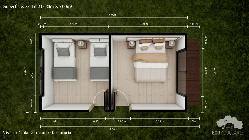 DORMITORIO/DORMITORIO Son 22,4 m2, Largo 7 metros, ancho de 3,2 metros y 2,4 metros de altura piso cielo. Equipamiento: Incluye Closet en ambos dormitorios. Valor desde $10.900.000.- puesta en fábrica en versión Elite (Valores Netos).Valor Equipamiento desde $1.990.000.- (Valores Netos). $10.900.000 + IVA